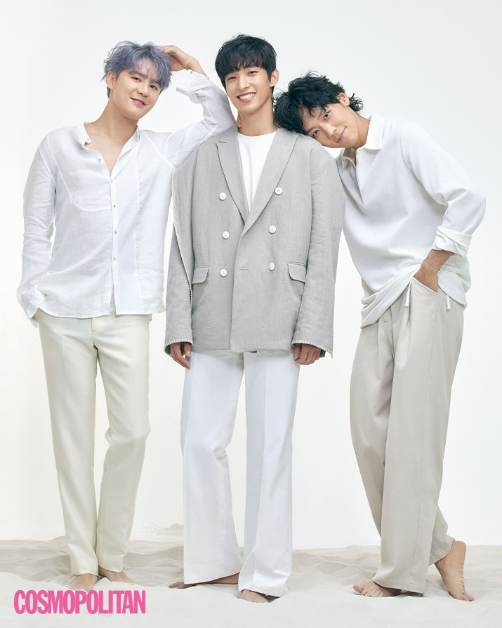 (준수)셔츠, 팬츠 스타일리스트 소장품. (도겸)재킷 32만8천원 노앙. 티셔츠 6만8천6백원 리버클래시. 팬츠 가격미정 빅팍. (카이)스웨터 15만원 코스. 팬츠 24만8천원 유스.