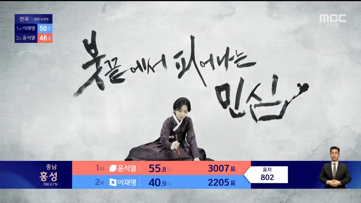 서예에 대한 애정이 물씬 느껴져요. 개인작업뿐 아니라 다방면으로 서예를 알리고 계시잖아요. 드라마 <동이>, <미스터 선샤인>에서 대필도 했고요. 올해 MBC 대선 개표방송에서 ‘붓끝에 피어나는 민심’을 주제로 전국 17개 시·도를 상징하는 낱말을 서예로 표현했어요.
