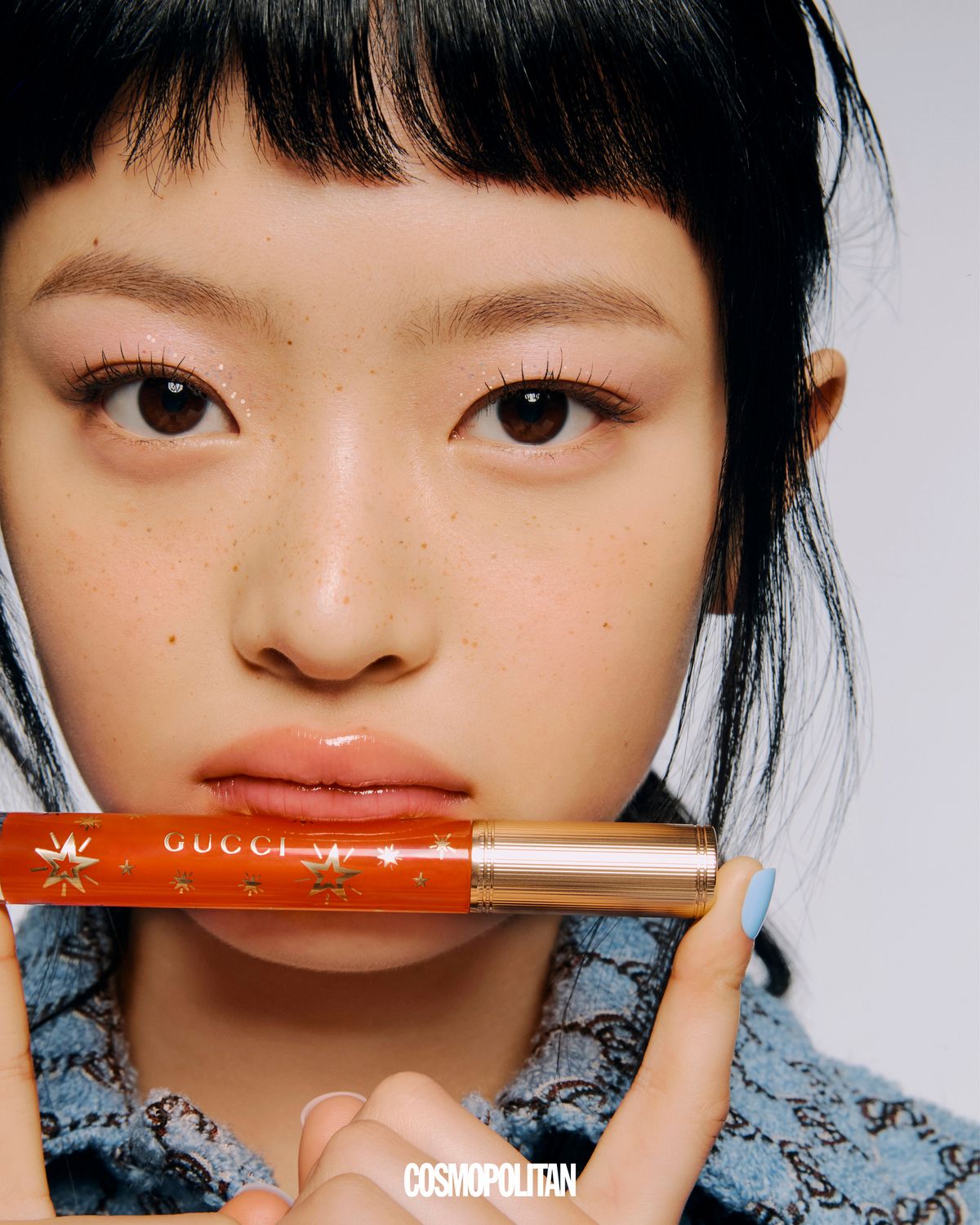 구찌뷰티 팔레트 드 보떼 콰티오 아이 팔레트 #03 와일드부케의 연보랏빛 섀도를 눈두덩 전체에 넓게 발라 신비감이 느껴지는 아이 메이크업 룩을 연출했다. 구찌뷰티 크레이용 데피니씨용 쑤르씰 파우더 아이브로우 펜슬 #02 블론드와 #04 브룬을 사용해 콧대에서 볼과 이마 라인으로 퍼지는 불규칙한 점을 찍어주면 자연스러운 주근깨 완성. 그다음 설탕 시럽으로 코팅한 듯 탱글한 탠저린 레드빛의 입술을 위해 광택감을 자랑하는 구찌뷰티 글로스 아 레브르 #526 테레지나 레드를 오버 립으로 여러 번 덧발랐다. 재킷 가격미정 Gucci.