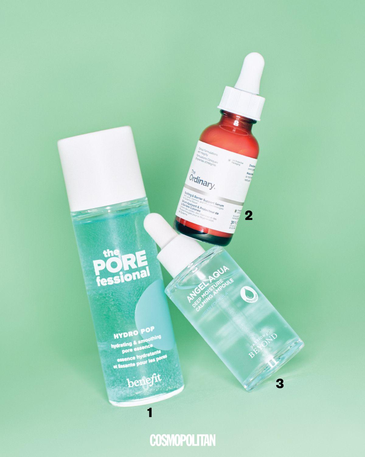 단, 절대 피부를 자극하지 않을 만큼의 온도 설정이 중요하다. 얼굴 전체를 세안제로 가볍게 닦아낸 다음 모공 전용 팩이나 클레이 팩을 모공 고민 부위에 두껍게 바르고 10분 정도 지나 마사지하듯 손가락으로 롤링하며 불어난 피지 찌꺼기와 노폐물을 제거한다. 두 번째는 보습 성분으로 과다 피지를 정돈하는 단계. 매트한 모공 세럼이 아니라 수분으로 유분감을 잡는다고? 여름에 피지가 증가하는 건 땀과 유분이 뒤섞인 일명 개기름일 수도 있지만 실상은 유·수분 밸런스가 붕괴돼 수분이 부족하다는 시그널로 피지가 과도하게 분비되기도 한다. 이때 무작정 피지를 제거하기보단 피부 속 수분을 차곡차곡 채워주면서 포어 컨트롤 세럼을 함께 사용하면 역설적이게도 피지가 덜 분비되고 피부는 한결 촉촉해지는 걸 경험할 수 있다.