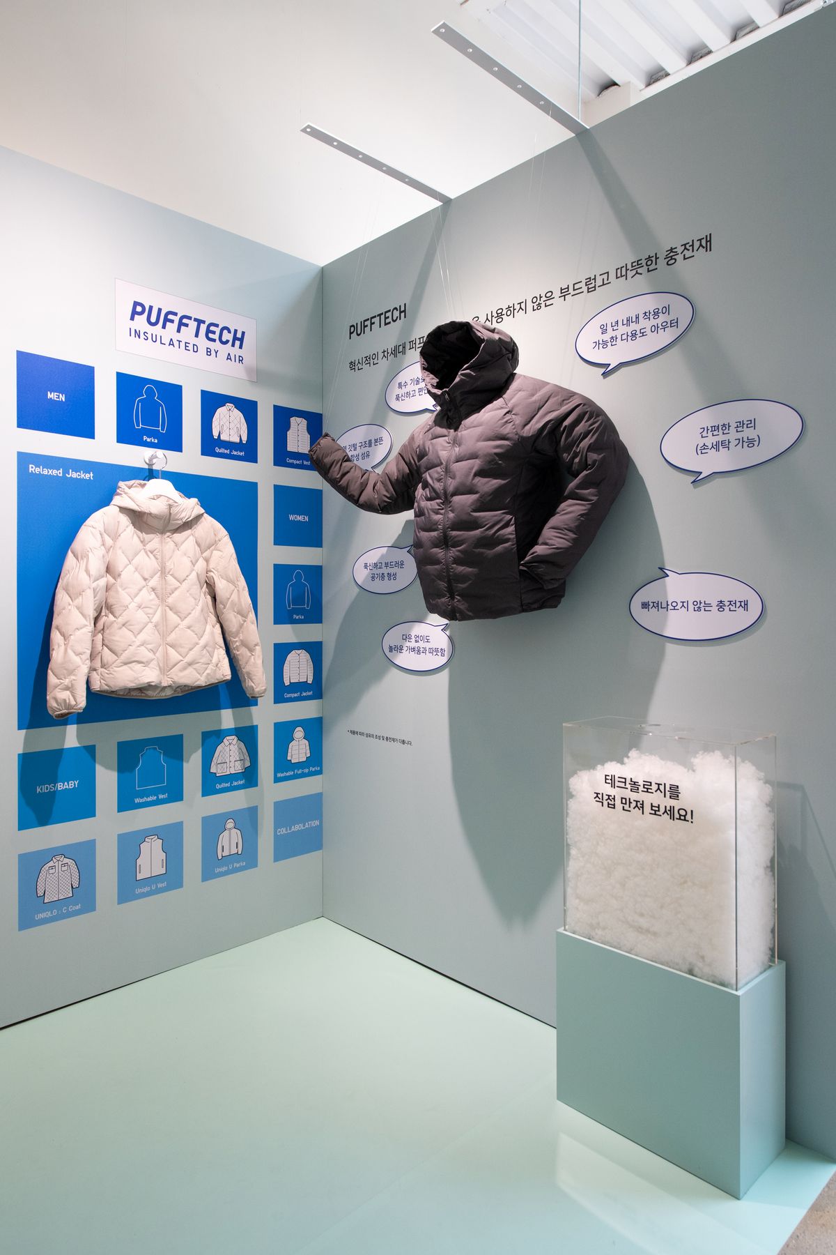 퍼프테크는 유니클로와 섬유화학업체 도레이(Toray)가 공동 개발한 기능성 충전재를 사용한 제품 일체를 지칭한다. 따뜻하고 가벼운 이 충전재는 실제로 만져보면 일반 솜보다 가볍고 얇은 섬유로 얽혀 있는 걸 볼 수 있는데, 머리카락의 약 5분의 1두께에 준하는 미세한 입자를 자랑한다고. 이 섬유를 스프링처럼 연결해 필파워를 높임으로써 보온성과 신축성, 탄력성을 높였다. 또한 끝이 뾰족한 동물의 털과 달리 외피를 잘 뚫고 나오지 않으며, 손세탁이 가능해 관리도 용이하다. 퍼프테크가 적용된 제품들은 이름만 ‘파카’이지 우리가 자주 보았던 경량 아우터웨어에 가깝다. 가볍고 컴팩트해서 환절기를 포함해 일 년 내내 입을 수 있다는 뜻.