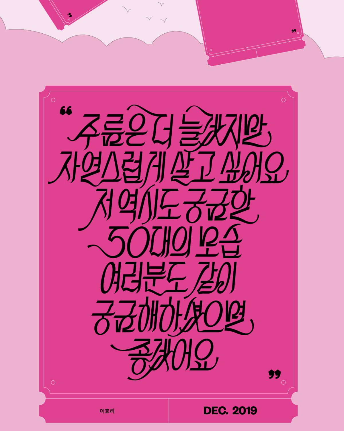“어떻게 나이 들어야겠다고 마음먹거나 생각하는 건 그다지 중요하지 않아요. 다만 흘러가는 대로, 자신에 대해 잘 알아가는 게 중요하죠.”