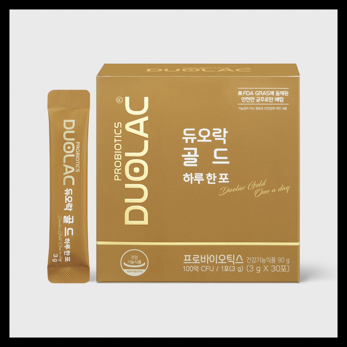 세계 특허 ‘듀얼 코팅 기술’을 적용해 생존력이 강하고 실온 보관이 가능하며, 콜레스테롤 감소에 효과가 있다. 듀오락 골드 하루 한 포