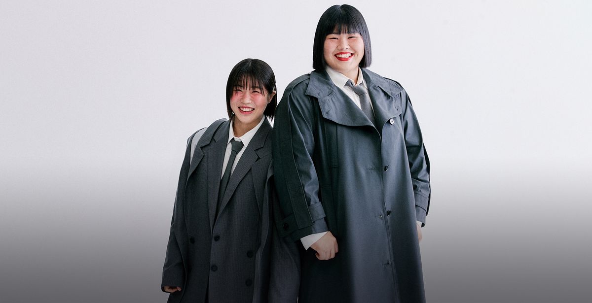 (허미미)오버사이즈 재킷, 팬츠 모두 Moohong. 이너 셔츠, 타이, 슈즈 스타일리스트 소장품. (김하윤)트렌치코트 H&M. 데님 팬츠 Moohong. 이너 셔츠, 타이, 슈즈 스타일리스트 소장품.
