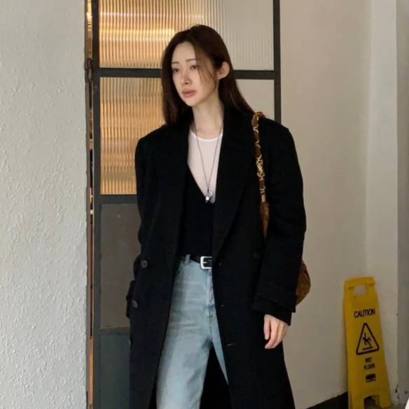 블랙 컬러의 더블 버튼 코트를 청순한 느낌으로 소화해낸 묵화. 네이비 컬러의 카디건을 숄처럼 어깨에 두르고 와이드 데님에 로퍼를 신어 마무리했다.