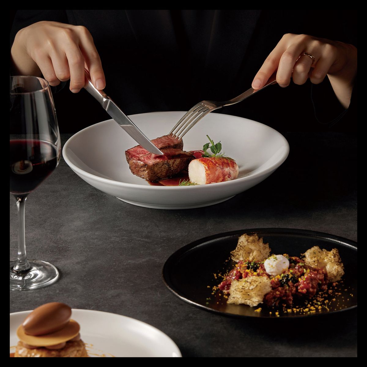 아일랜드산 굴, 소고기 육회, 버섯 수프, 은대구, 한우 안심, 헤이즐넛 다쿠아즈로 구성된 6코스 디너를 만나보자. 문의 051-990-1300