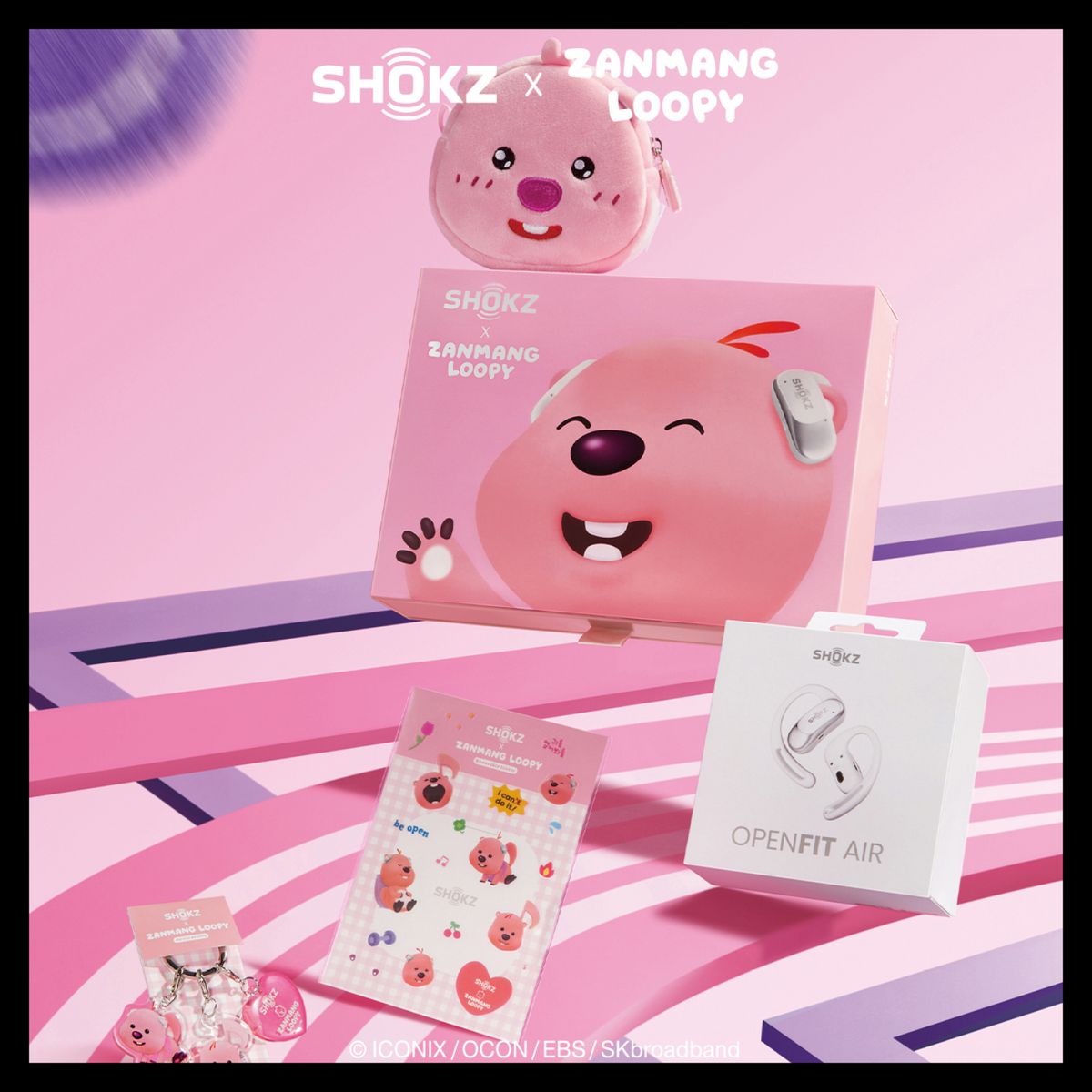 샥즈의 공기 전도 이어폰 ‘오픈핏 에어’와 잔망루피 파우치, 키 링, 스티커 패키지 구성의 협업 에디션을 출시했다. 문의 1661-6373