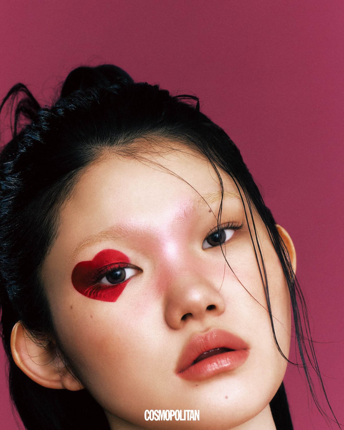 초콜릿 색 입술과 핑크빛으로 물든 두 뺨, 그리고 붉게 반짝이는 하트가 어우러진 밸런타인 메이크업.