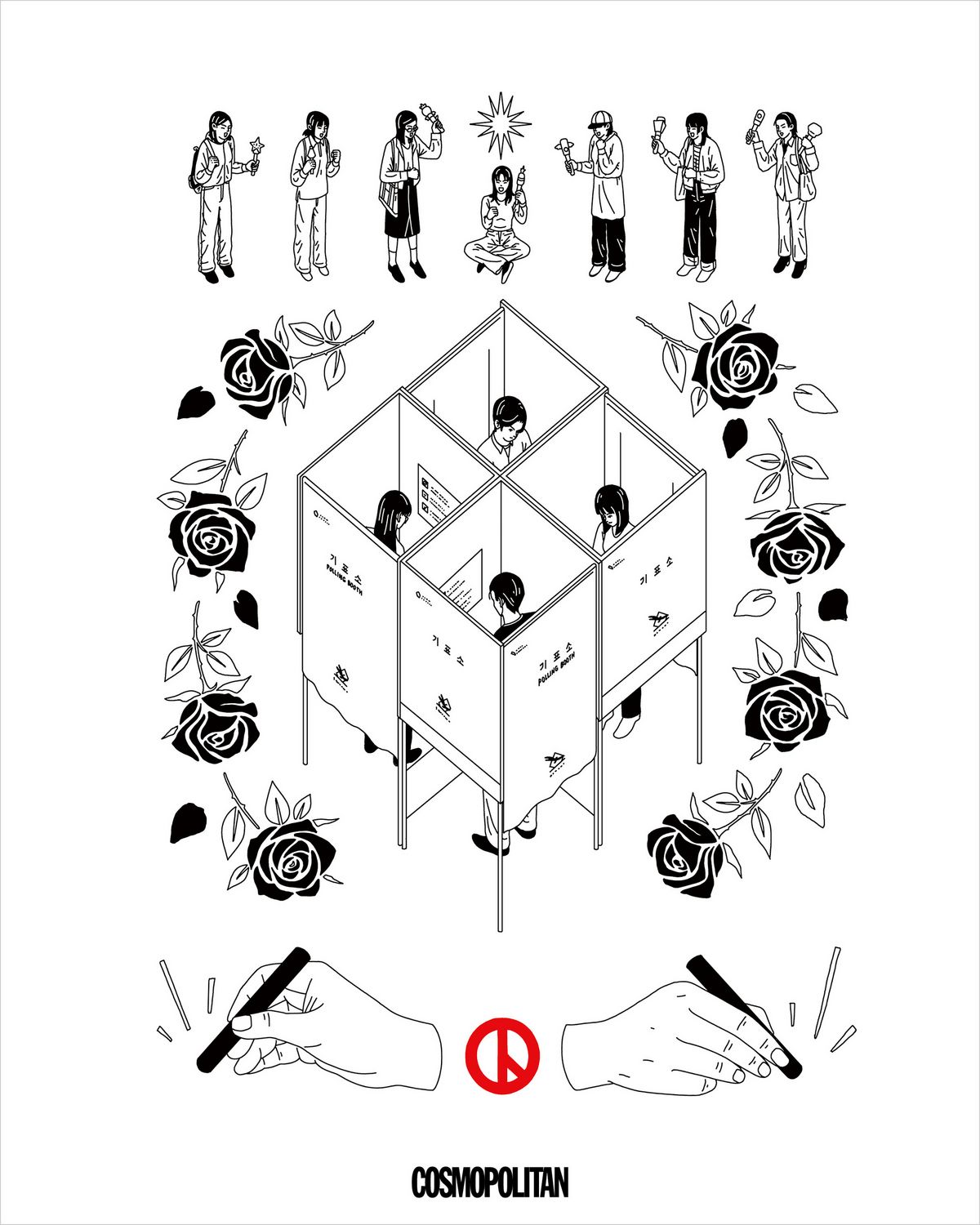 “아무 일도 일어나지 않았다.” 2024년 12월 3일 밤에 대한 전직 대통령 윤석열 씨의 주장이다. 이 말이 마음 어딘가를 건드렸다면, 당신은 분명 6월 3일을 기다리고 있을 것이다. 오는 대선을 규정하는 단 하나의 문장이 있다면, 나는 감히 이 말을 꼽는다. 사상 초유의 비상계엄을 선포한 윤석열 씨는 헌법재판소의 탄핵 심판정에 나와 이러한 궤변을 늘어놓았다. 이 글을 읽고 있는 누구든, 2024년 12월 3일 밤은 생생할 것이다. 어제 점심에 뭘 먹었는지는 가물가물해도, 그날만큼은 기억이 강렬하게 남을 수밖에 없다. 총을 든 군인들이 국회로 진입하는 장면을 실시간으로 목격했다. 관련한 심리학 용어도 있다. ‘섬광기억(flashbulb memory)’, 놀랍고 충격적인 순간을 생생하게 지속적으로 기억한다는 의미다. 파면 여부를 최종 결정하는 헌법재판소에서도 직무가 정지된 대통령은 성의 없는 거짓말로 일관했다. 그에 발맞춰 “경고성 계엄”, “계엄령이 아닌 계몽령”이라는 주장이 횡행했다. 그런 가운데 겨우 체포했던 윤석열 씨에 대해, 법원은 ‘날(일수)이 아닌 시간’을 기준으로 해야 한다는 전무후무한 결정으로 구속을 취소해버렸다. 검찰 또한 즉시 항고하지 않으면서 윤씨는 자유로운 몸이 되었다. 반면 그의 임무를 충실히 따랐던 부하들은 구속된 상태다. ‘끝날 때까지 끝난 게 아닌’ 내란의 면모를 우리는 아직도 지켜보는 중이다. 그래서 비상계엄 이후 나는 곧잘 상식을 의심하는 사람이 되었다. 때로는 염세주의자가 되었다. 전 세계의 민주주의가 아스라이 무너지는 거대한 조류 한가운데 우리 또한 예외 없이 살고 있는 게 아닌가 하는 패배감을 마주하기도 했다. 그럴 때마다 수렁에 빠진 마음을 구해주는 동료들이 있었다. 이들은 거대한 폭력에 맞서 본능적으로 국회 앞으로 한달음에 뛰어갔다. 쿠데타를 일으킨 이에게 당장 물러나라며 응원봉을 흔들고 흥겹게 노래를 불렀다. 수사기관의 정당한 법 집행 위에 군림하는 무리에 맞서 눈 내리는 거리에서 웃으며 밤을 새웠다. 세상은 이들을 향해 ‘응원봉 연대’, ‘키세스단’이라는 자랑스럽고 사랑스러운 이름을 붙였다. 그 중심에 청년 여성이 있었다. 과장이 아니다. 현장에 나가 피부로 느낀 감각이다. 데이터도 뒷받침한다. 서울시에서 제공하는 생활 인구 데이터 분석에 따르면, ‘대통령 윤석열 탄핵 소추안’이 국회에서 통과된 2024년 12월 14일 서울 여의도 국회 앞에 모인 시민은 42만여 명이다. 이들의 3명 중 1명이 20~30대 여성이다.