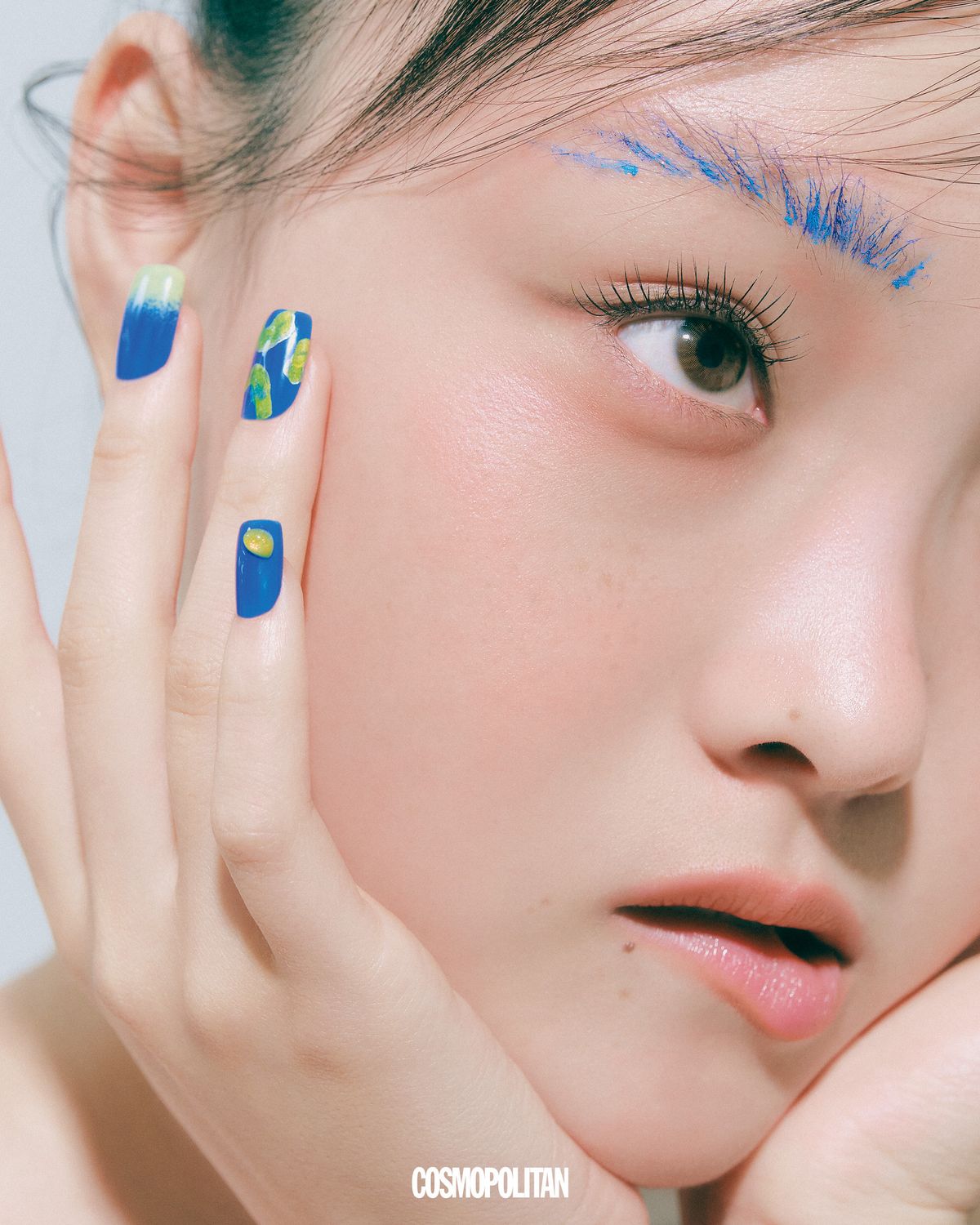 강렬한 블루 컬러는 얼굴 메이크업 시 소화하기 까다로운 색 중 하나다. 특히 네온 블루는 더욱 그렇다. 이를 넓은 면이 아닌 ‘선’의 디테일로 풀어낸 것이 이번 룩의 핵심. 눈썹 결을 따라 블루 컬러를 한 올 한 올 섬세하게 그려 넣어 이질감 없이 시원한 포인트를 완성했다. 손톱에는 채도 높은 네온 블루를 베이스로 바른 뒤 네온 옐로 컬러로 그러데이션과 얼룩 패턴을 더하고, 물방울 파츠까지 얹으면 여름과 찰떡인 청량한 색감 대비가 완성된다.