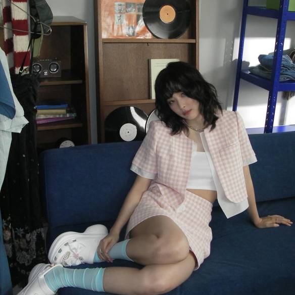채령 역시 시원한 래쉬가드 룩으로 눈길을 끌었다. 몸에 핏되게 밀착된 지퍼 슬리브리스 톱에 크림색 데님 쇼츠를 매치해 활동성과 스타일을 모두 챙긴 것. 이너로 레이어드한 노란색 스트라이프 수영복 톱이 포인트 역할을 했고, 블랙 벨트로 허리 라인을 강조하며 실루엣을 정리했다. 페스티벌 후 그대로 물놀이에 가도 손색없을 만큼 청량한 여름 캐주얼 룩. 어디까지나 유교걸이지만, 디테일은 챙기고 싶다면 올 여름은 래쉬가드다!