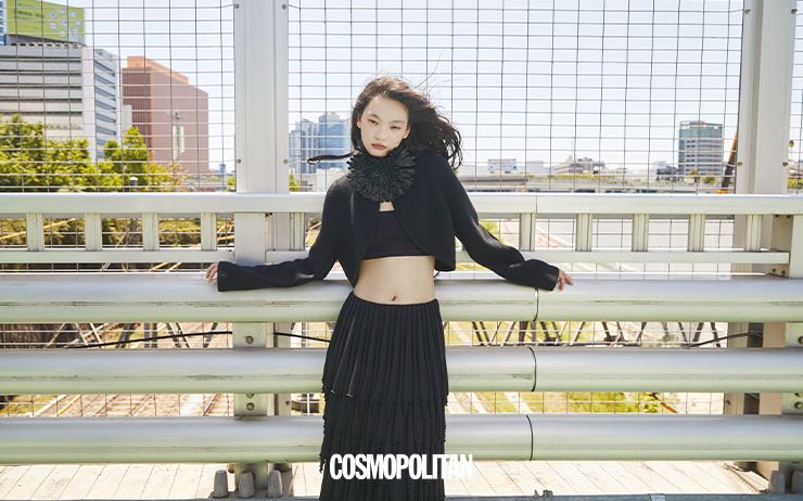 니트 카디건, 스커트, 플라워 목걸이 모두 가격미정 Alaïa. 톱 핸들 백 가격미정 Bottega Veneta. 이너 톱 에디터 소장품.