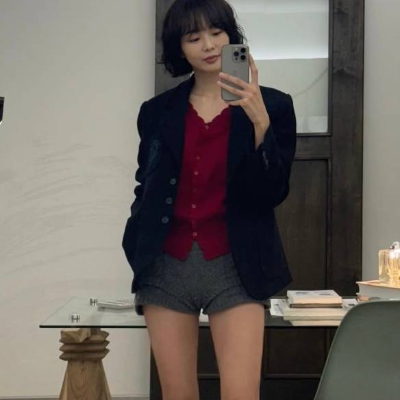 김나영은 기본 핏의 흰 티셔츠에 블랙 슬랙스, 그리고 메쉬 플랫을 심플하고 클래식하게 매치한 뒤, 블루와 네이비 패턴의 스카프를 허리에 둘러 멋스러운 데일리 룩을 연출했어요.