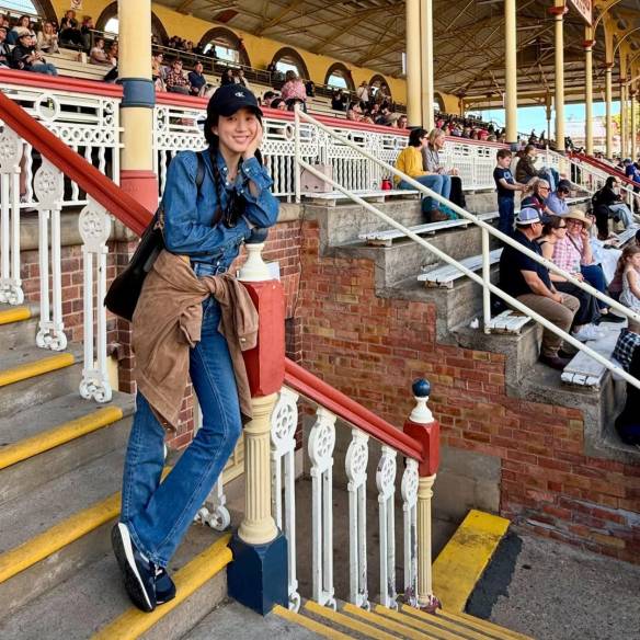 정려원의 편하면서 러블리한 여행 패션. 화이트 컬러의 맨투맨을 입고 롱한 기장감의 캉캉 스커트, 그리고 데님과 스니커즈를 매치한 후 레오파드 패턴 백을 매치한 정려원. 그녀의 백은 이미스 제품이에요.