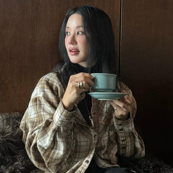 가을이 되면 왜인지 브라운 컬러가 자꾸만 끌립니다. 엄정화도 그런 우리의 니즈를 반영한 듯, 가지각색 브라운 컬러로 옷을 입었는데요. 진한 갈색의 카디건, 그리고 한 톤을 낮춘 브라운 코듀로이 바지를 입어 톤온톤 코디의 정석을 보여주었죠. 너무 다 같은 색으로만 입으면 심심하니 이너는 화이트 실크를 입어 밸런스를 맞췄네요. 여기서 한 가지. 브라운 룩에 가장 좋은 액세서리는 바로 골드입니다. 실버가 여름에 찰떡이라면 골드는 가을에 찰떡이거든요. 엄정화처럼 목걸이, 팔찌를 곳곳에 활용해 포인트를 살려보세요!