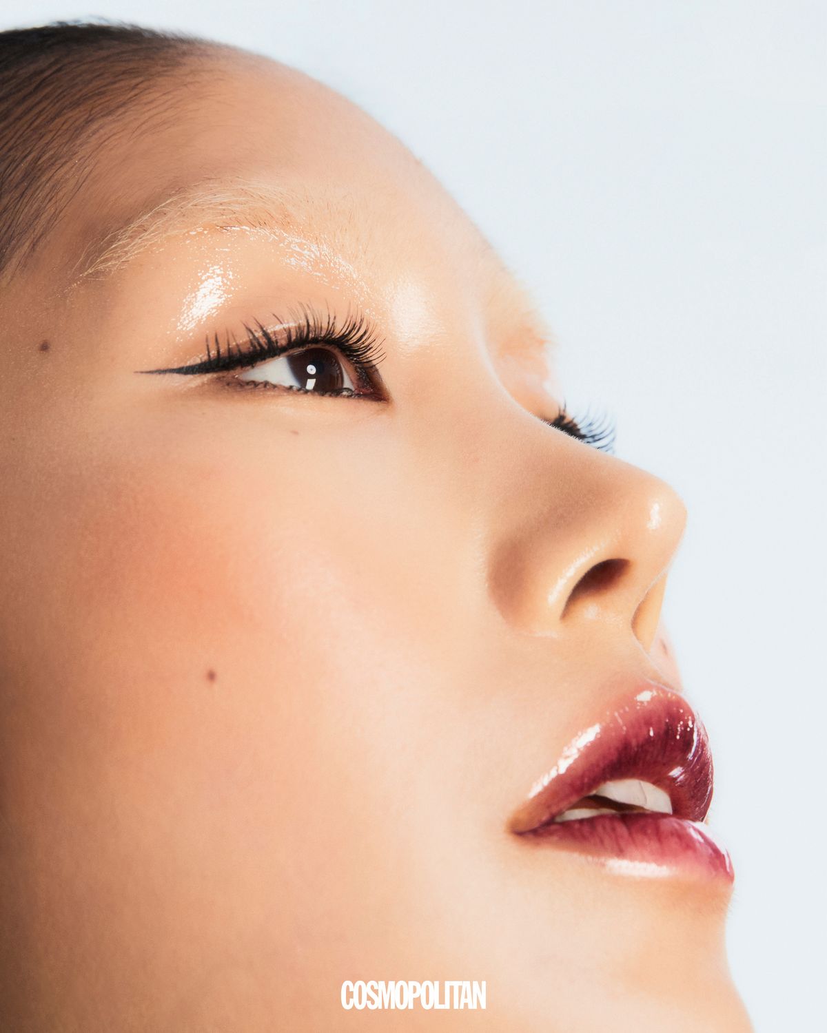 윤기와 그림자가 공존하는 얼굴, 말간 빛과 깊이 있는 음영이 절묘한 균형을 이룬다. 촉촉한 크림 타입의 바비 브라운 롱헤어 크림 섀도우 스틱 토피를 눈두덩에 넓게 펴 바르고 그 위에 투명 글로스를 겹치듯 얹어 유리막을 씌운 듯한 질감을 만든다. 룩의 통일감을 위해 입술은 누디한 컬러감을 자랑하는 리스키 뷰티의 비 볼드 립글로스 멈블리를 립 라인을 따라 채우고, 광을 더한다.