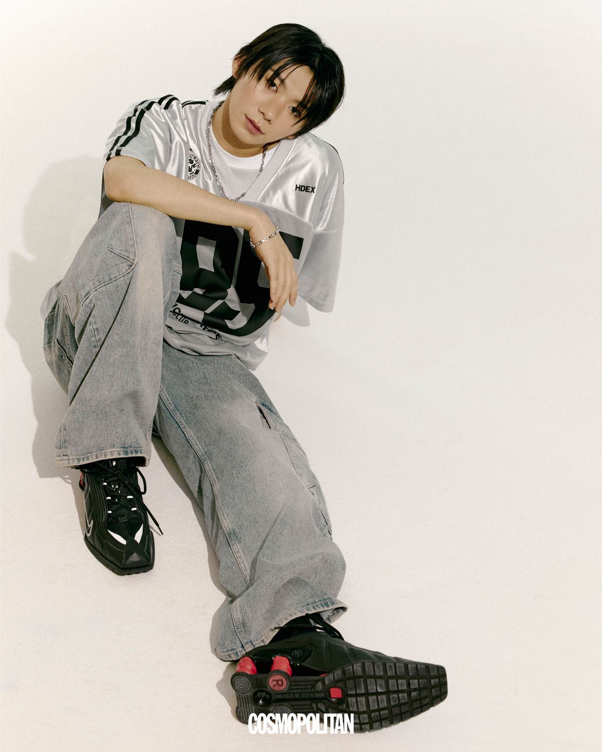 풋볼 티셔츠 Cotchs. 데님 팬츠 Xtonz. 슈즈 Converse. 이너 톱, 목걸이, 팔찌, 암 밴드 스타일리스트 소장품.