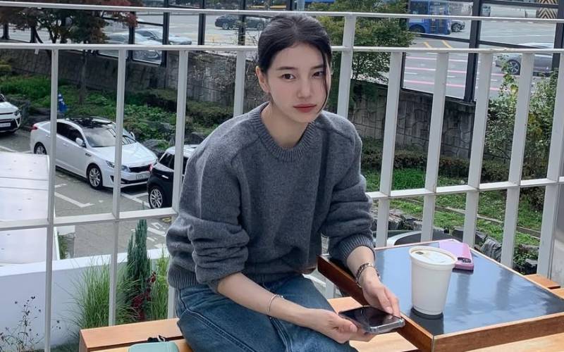 퍼 코트를 힙하게 연출한 제니! 블루 그레이 컬러의 퍼코트에 슬리브리스 톱과 로우 라이즈 데님 팬츠를 매치해 트렌디하게 스타일링했는데요. 오버사이즈 데님 팬츠의 밑단을 내추럴하게 접어 올려 뾰족한 앞코를 살짝 드러내 룩의 완성도를 높였습니다.