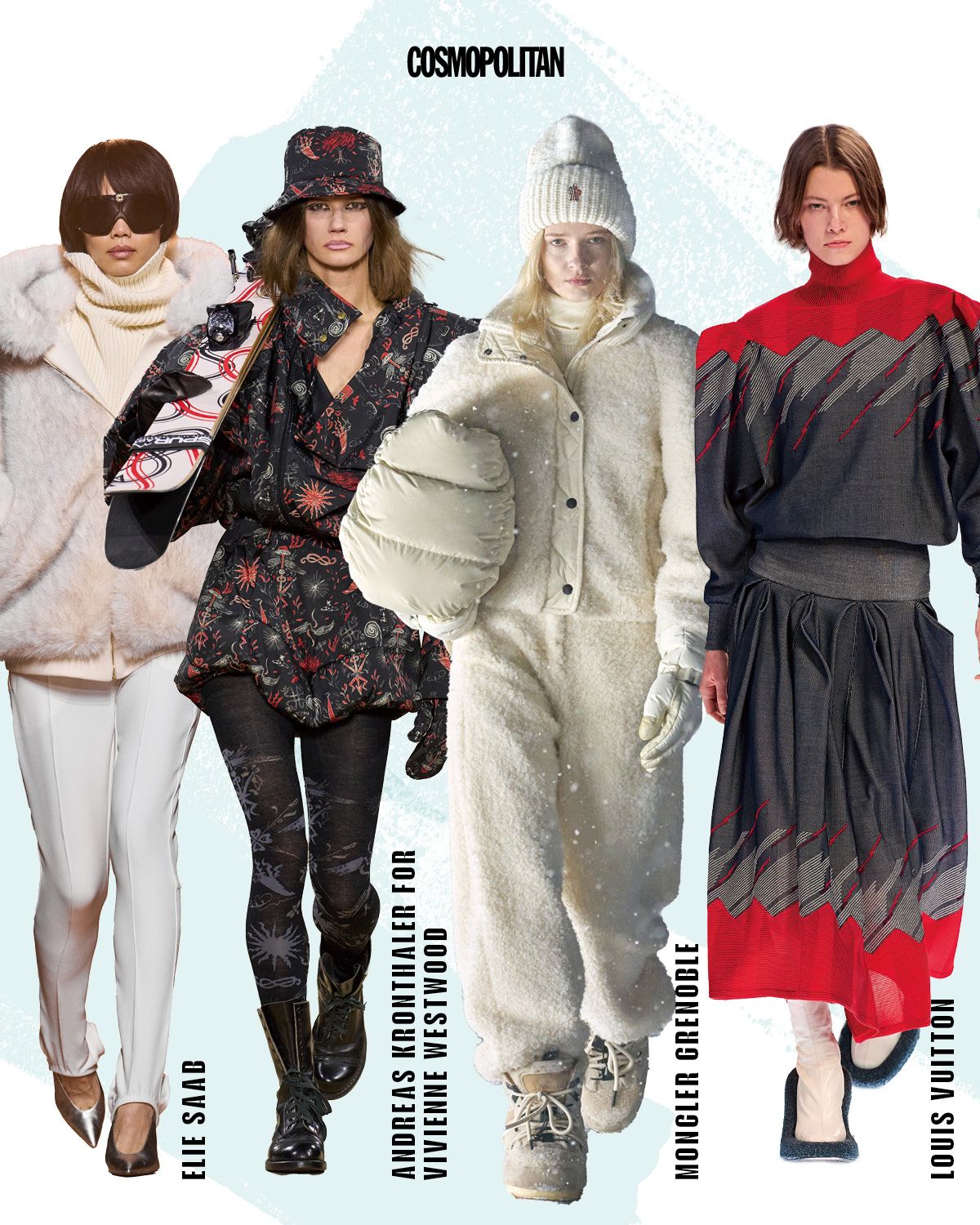 이 밖에도 케이블 니트 차림의 재클린 케네디 오나시스(1960년대), 타이트 팬츠를 입은 브리지트 바르도의 스타일(1970년대) 역시 ‘빈티지 스키’ 하면 떠오르는 레전드 신으로 회자된다. 시기도, 취향도 다른 이들의 모멘트는 결국 ‘아프레스키(Après-ski)’라는 하나의 줄기로 통한다. 프랑스어로 ‘이후에’라는 뜻의 ‘après’와 ‘ski’의 합성어로 ‘스키 후의 시간’을 의미하는 아프레스키는 스키를 탄 뒤 리조트나 별장 등 인근에서 펼쳐지는 사교 활동과 휴식, 식사 시간 등을 모두 포함하는 개념이다. 이 때문에 투박한 스노 부츠, 슬로프에 반사된 햇빛을 차단하는 선글라스나 고글, 추운 날씨에 대비하는 다양한 방한 액세서리, 스키복 사이로 입고 벗기 쉬운 니트웨어를 중심으로 발전한 것이 기본적인 드레스 코드. 1963년 영화 <샤레이드>의 첫 장면이 이 문화를 잘 표현한다. 슬로프를 질주하는 스키어들을 뒤로한 채, 햇살 가득한 테라스에서 브런치를 즐기는 오드리 헵번이 등장한다. 발라클라바가 더해진 캣슈트에 퍼 코트, 비니와 오벌 선글라스, 장갑까지 브라운 컬러로 맞춰 입은 그가 이동한 곳은 실내 수영장. 눈 덮인 산꼭대기에서 휴양을 즐기는 이들의 모습은 부유하며 여유롭기 이를 데 없다. 당대의 할리우드 스타들, 로열패밀리가 즐겼을 바로 그 모습이다. 알프스와 오스트리아 티롤, 북미, 일본 등 지역마다 분위기 차이는 있으나 아프레스키 활동은 오후 늦게 리프트 운행이 끝난 뒤 시작한다. 샴페인, 맥주, 스파, 요즘은 DJ 공연도 즐기는 이 고급 휴양 문화를 두고 <사우스차이나모닝포스트(SCMP)>지는 ‘원조’ 스텔스 웰스(Stealth Wealth)라 표현했다. 과시하지 않고 절제된 방식, 즉 소재나 태도로 드러나는 품위라는 거다. 콰이어트 럭셔리와 결을 같이하는 이 개념 속에 뜻밖에도 스포츠웨어가 당당히 자리를 차지했다. 즉 스키 패션은 기능복과 리조트 라이프스타일을 넘나드는 상징물이기도 하다. 스키복을 입은 채 샴페인을 마실 수 있는, 보기 드문 스포츠웨어의 미장센을 실현한 이 복장은 럭셔리 패션 하우스에 의해 지금까지 명맥을 이어오고 있다.