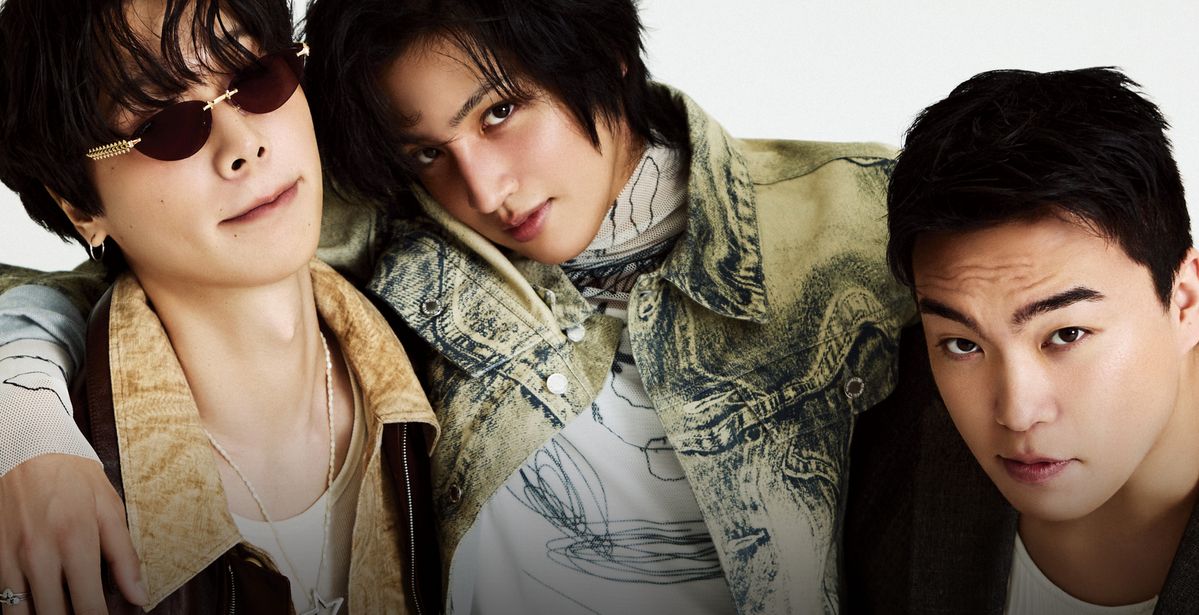(왼쪽부터, 정민혁)레더 재킷, 팬츠 모두 Ferragamo. 셔츠 Millo Archive. 팬츠에 묶은 스카프 Gila Archive. 선글라스 Cartier. 목에 건 별 모양 안경 Gentle Monster. 귀고리 본인 소장품. 이너 톱, 목걸이 체인 스타일리스트 소장품. (우석)데님 재킷, 데님 팬츠 모두 Camperlab. 이너 톱 Balmung. 벨트 (위부터)Bell & Nouveau, 스타일리스트 소장품, Balenciaga. 반지 본인 소장품. (오명석)재킷, 팬츠 모두 Lemeteque. 이너 톱, 행커 치프 스타일리스트 소장품.