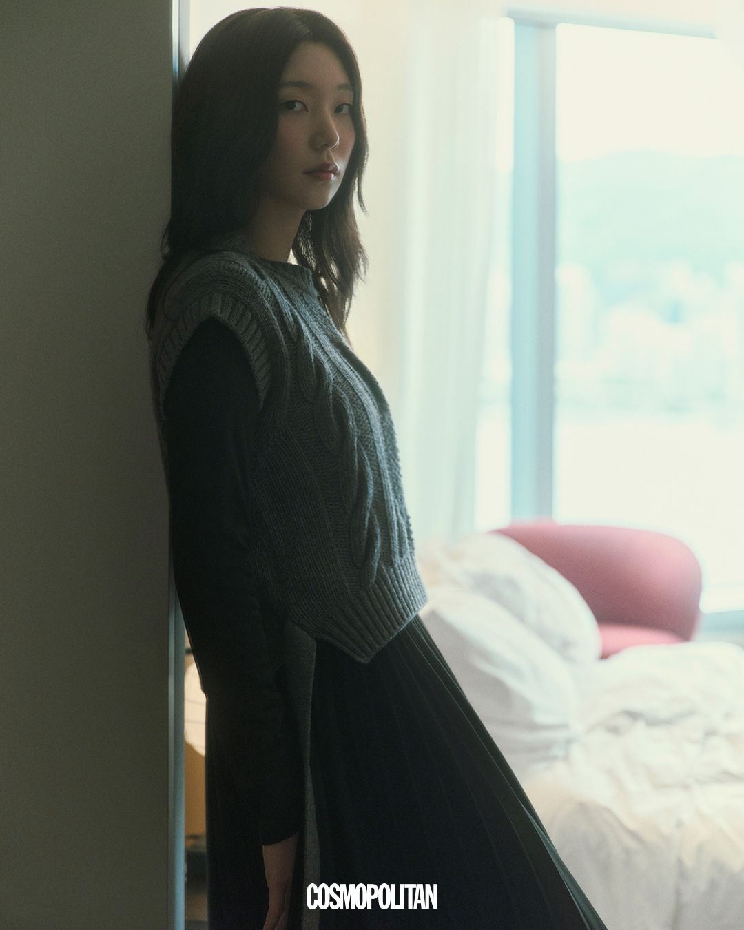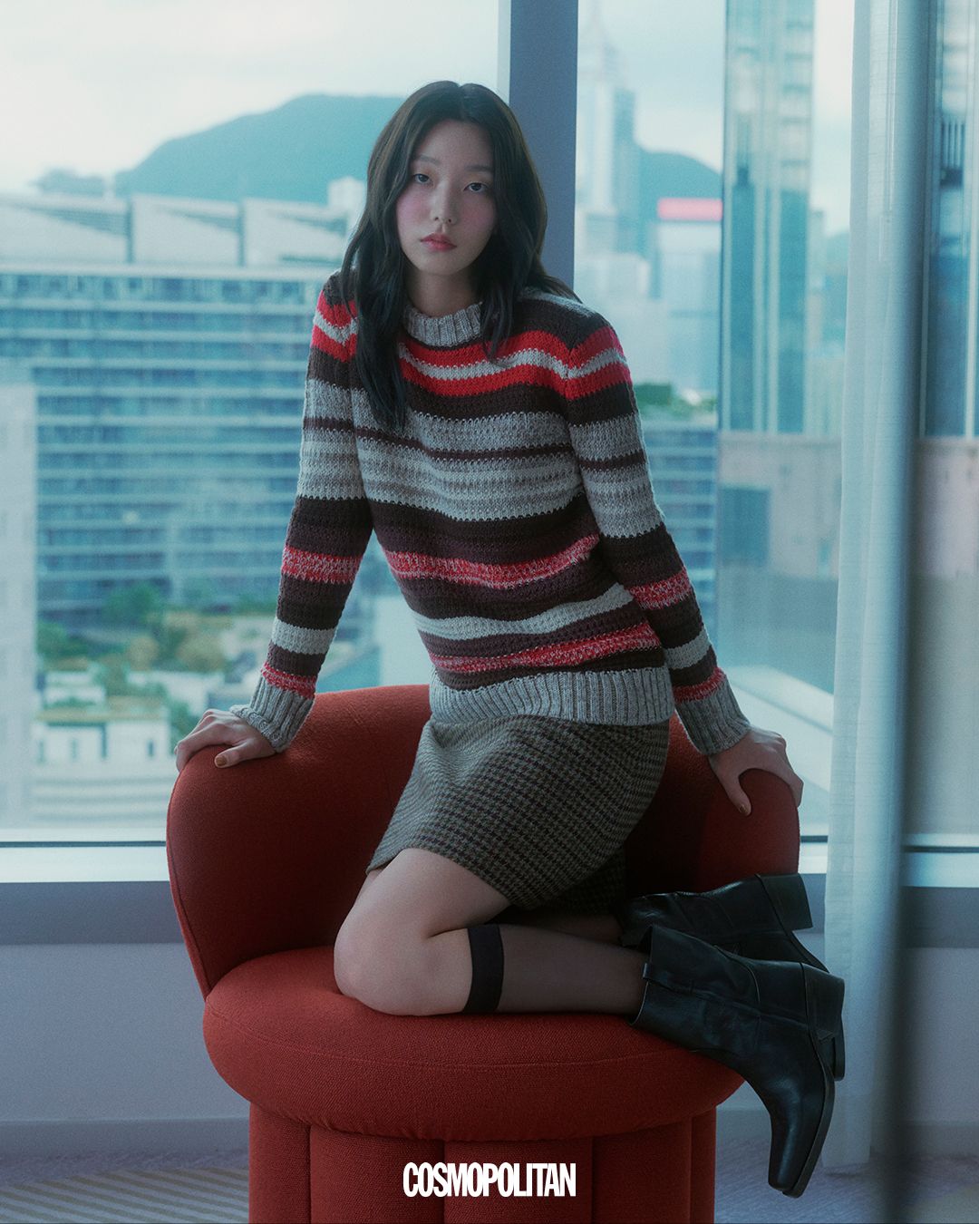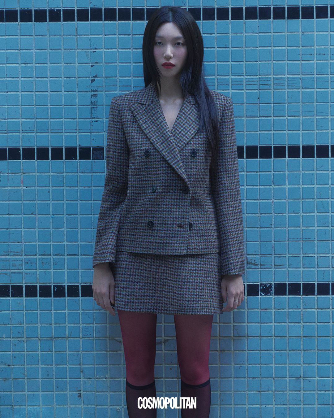 제루지아 버진울 재킷, 바타 버진울 스커트 모두 Weekend Max Mara. 레드 스타킹 스타일리스트 소장품.