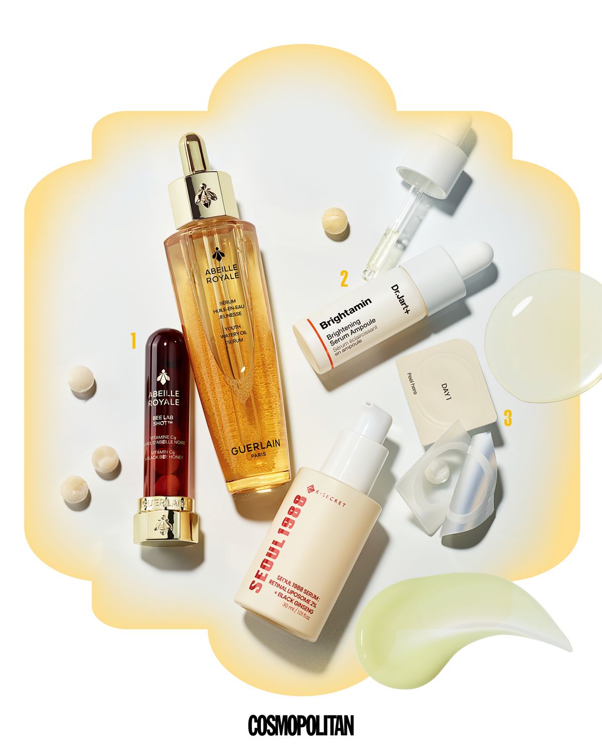 1 7개의 동결건조된 비즈가 담긴 아베이 로얄 비 랩 샷은 블랙 비 허니, 20%의 비타민 C 유도체를 포함한 안티에이징 성분을 함유해 피부에 즉각적인 광채와 활력을 더한다. 특히 겔랑의 아베이 로얄 유쓰 워터리 오일 세럼과 함께 사용하면 고농축 안티에이징 성분의 시너지로 7일 만에 한층 더 매끄러워진 피부 결을 경험할 수 있다. (왼쪽부터)아베이 로얄 비 랩 샷 8만9천원, 아베이 로얄 유쓰 워터리 오일 세럼 22만원 모두 Guerlain.