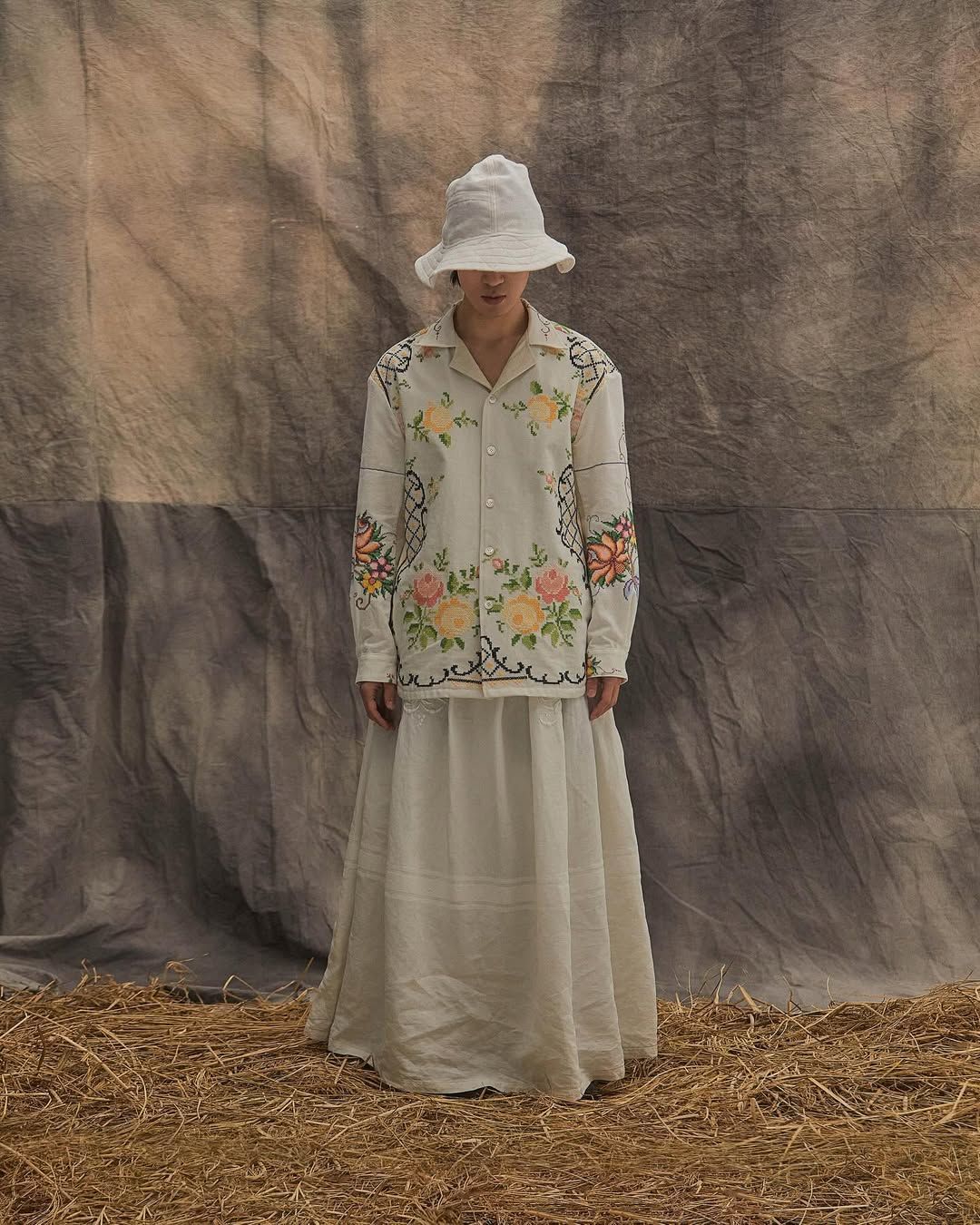 유즈드 원단인 자수보와 리넨으로 제작한 스커트.