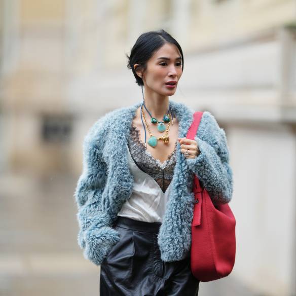 슬립 드레스의 가장 반전 있는 변신입니다. 부드러운 새틴 소재 위에 거친 레더 자켓을 얹는 순간, 룩은 훨씬 입체적으로 변합니다. 여기에 부츠까지 더하면? 시크한 애티튜드가 전면에 드러나죠. 특히 블랙 레더 자켓은 슬립 드레스의 여린 분위기를 단단하게 잡아주는 역할을 합니다. 실루엣의 대비가 분명할수록 슬립 드레스 특유의 관능미도 더욱 선명하게 살아나죠. 개인적으로는 이 믹스매치가 가장 매력적이라고 느껴집니다. 여성스러움과 강인함이 동시에 존재하는 룩이야말로 요즘 우리가 원하는 이미지 아닐까요? 낮에는 선글라스를 더해 시크하게, 밤에는 볼드한 액세서리로 과감하게 연출해보셔도 좋겠습니다.