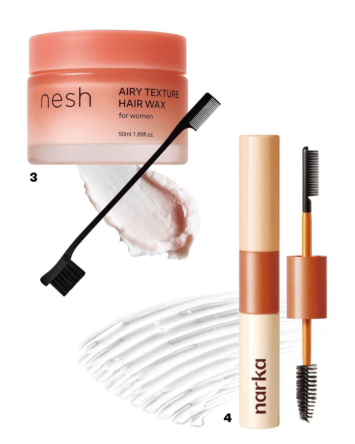 3 가볍게 발리면서 잔머리에 결만 살려 자연스럽게 연출하는 텍스처 왁스. 함께 판매되는 브러시를 사용하면 원하는 결 따라 손쉽게 정돈할 수 있다. 에어리 텍스처 헤어 왁스 2만5천원 Nesh.