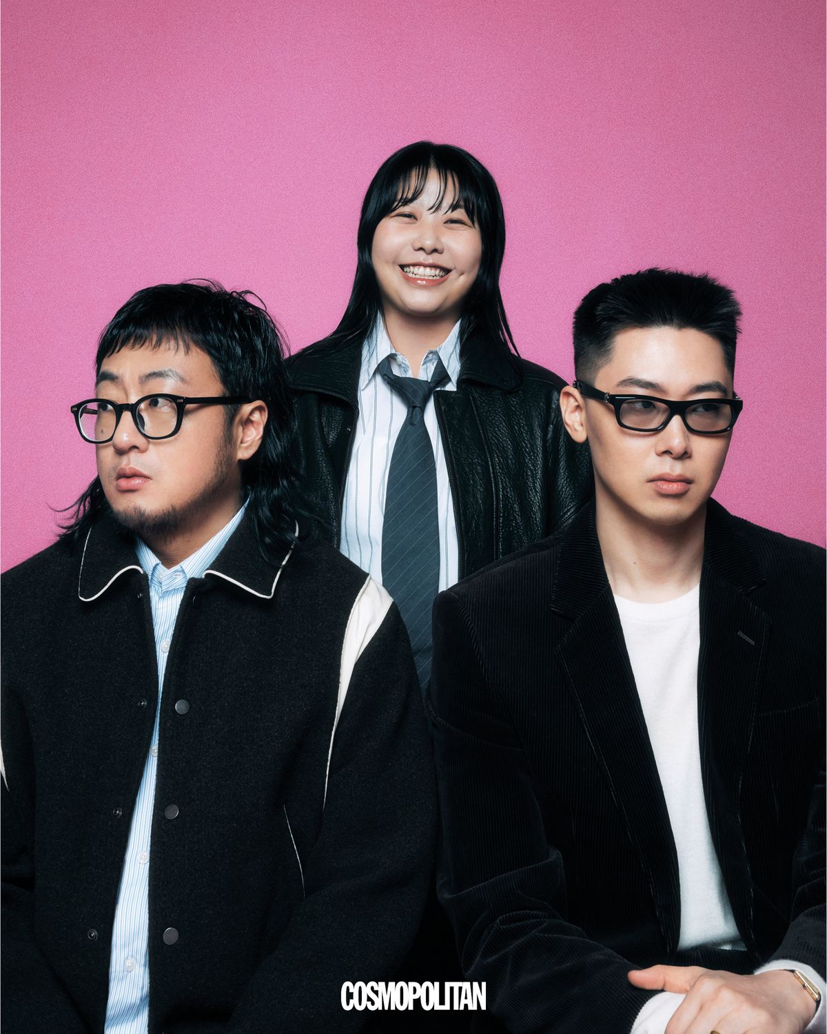 (왼쪽부터, 허키 시바세키) 레더 재킷, 이너 재킷, 셔츠, 팬츠, 슈즈 모두 Ferragamo. 선글라스 Effector. 반지, 목걸이 본인 소장품. (김간지) 재킷 Kaptain Sunshine. 셔츠 Onitsuka Tiger. 팬츠 Zara. 선글라스 Saint Laurent by Anthony Vaccarello. 타이 스타일리스트 소장품. (김민경) 재킷, 팬츠 모두 Cos. 셔츠, 타이, 슈즈 스타일리스트 소장품.