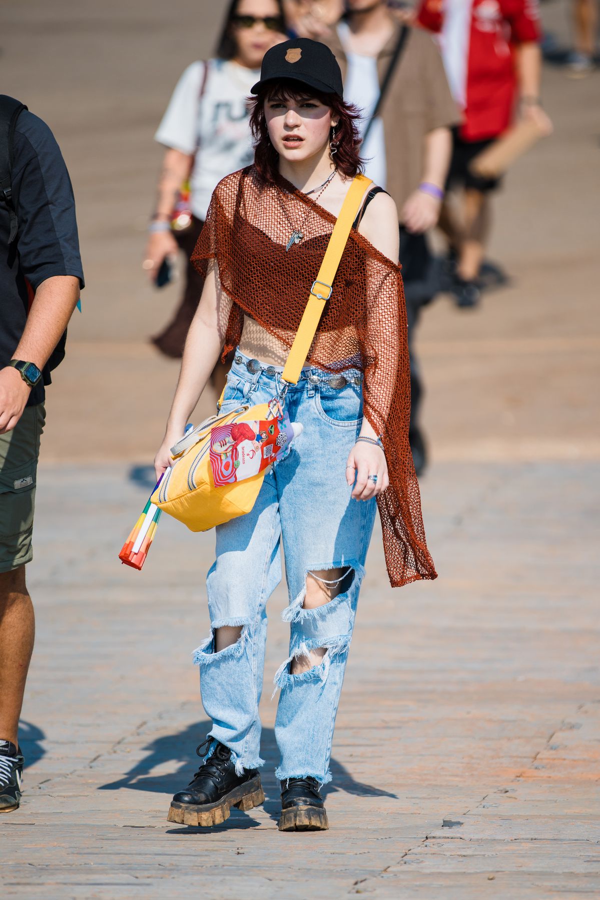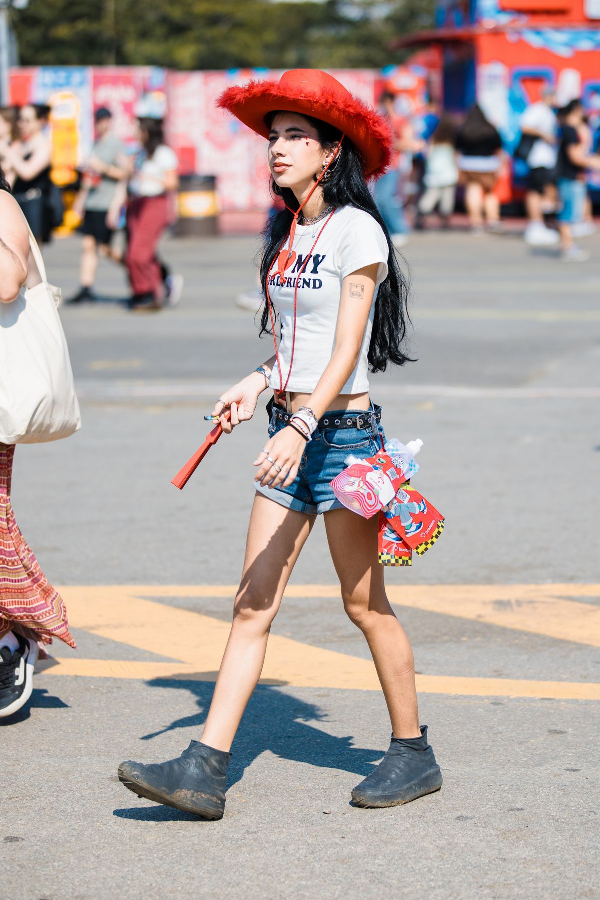 매번 말하는 조합이지만, 흰 티에 청바지는 실패가 없습니다. 성공 확률 100%예요. 이 코디 역시 흰티에 청바지를 입고 페스티벌을 즐겼습니다. 흰 티에 청바지가 너무 뻔하다고요? 액세서리를 팝한 걸 해주면 문제 해결! 흰 티 안에 있는 레터링 속 하트와 똑 닮은 빨간 모자를 챙겨 툭 걸쳐주면 바로 페스티벌 착장이 됩니다. 상의도 하의도 짧으니 빈 공간을 채워줄 액세서리 레이어링도 잊지 마세요!