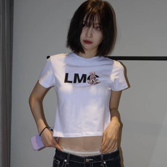 코코아 컬러의 얇은 반팔 니트에 아이보리 컬러의 반팔 셔츠를 겹쳐 입은 츄의 사랑스러운 반팔 셔츠 레이어드 룩. 헤어는 자연스럽게 컬을 준 시스루 뱅 스타일로 따스하고 부드러워 보이는 느낌을 연출했어요.