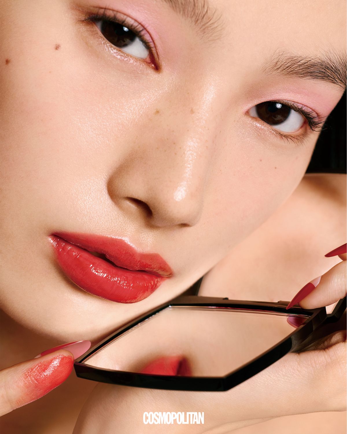 메가트렌드인 글로 립의 연장선에서 주목받는 오일리한 텍스처. 두껍게 광을 얹는 글로스 립과 달리 얇게 스며든 듯한 윤기가 특징이다. 오일리한 레드 립은 번지기 쉬운 만큼 베이스 정돈이 중요하다. 입술 외곽을 컨실러로 정리한 뒤 파우더로 마무리해 경계를 잡을 것. 제품의 팁 대신 브러시를 이용해 눕혀 바르면 훨씬 균일하게 밀착된다. 피부에도 은은한 광을 더하면 립의 질감과 자연스럽게 어우러진다.