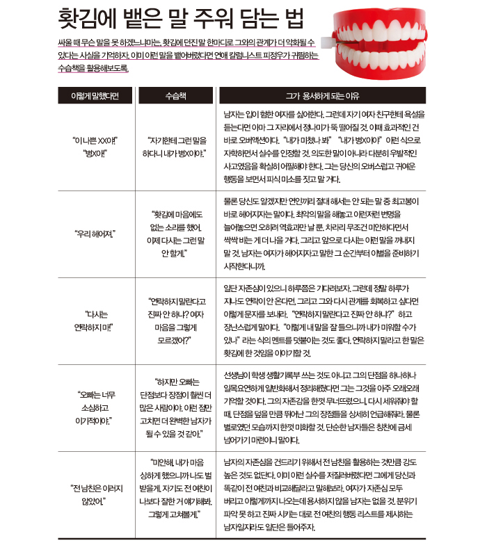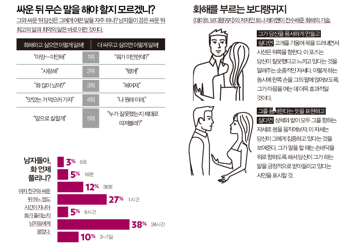 | 그에게 딱 맞는 맞춤형 화해법 침묵형 싸울 일이 있어도 입을 꾹 닫고 더 이상 아무 말도 하지 않는 침묵형. 전화 통화를 하다가도 ‘내일 얘기하자’면서 싸움을 피해버리는 이런 남자들의 경우에는 사실 마음속에 할 얘기는 넘치지만 평소에 버릇이 돼 있거나 자기가 나쁜 사람처럼 보일까 봐 말을 하지 않는 것일 가능성이 높다. 사실 이런 타입의 남자와 평화롭게 지내기 위한 가장 효과적인 방법은 그가 혼자만의 시간을 갖도록 내버려두는 것이다. 그러면 얼마 뒤에 알아서 화를 풀고 찾아와 당신에게 화해를 요청할 테니까. 잔소리형 마음속에 있는 이야기를 전부 내뱉어야 직성이 풀리는 타입. 자기 자신을 정당화시키기 위한 장치로 여러 가지 논리를 내세운다. 이런 유형과 화해하는 법은 상대방처럼 똑같이 엄격하게 따져보는 것이다. “너도 잘못이 47% 정도 있고, 나는 52% 정도 있고, 한 1% 정도는 지나가는 아저씨 탓도 있다” 이런 식으로 정말 깔끔하게 정리해줘라. 이런 방법이 힘들다면 계속 상대방의 논리에 맞장구치면서 경청해주다가 스스로 모순에 빠질 때를 노리는 것이 방법. 그때 그의 모순을 지적하면서 반박하면 그는 결국 꼬리를 내리고 말 거다. 기억상실형 뒤끝이 없는 걸 넘어서 지나치게 쿨한 나머지 자기 속은 편해도 상대방 속은 들끓게 만드는 타입. 물론 당신 역시 기억상실형이라면 이보다 더 좋은 궁합은 없을 거다. 아무리 화날 일이 있어도 서로 기억상실형인 두 사람의 조합에서 싸움이란 없을 테니까. 하지만 만약 남자 쪽만 기억상실형이라면 정말이지 답답할 노릇일 거다. 당신의 분노와 서운함을 그에게 이해시키면서 화해를 하고 싶다면 공격적인 자세는 금물. 일단은 저자세로 접근해야 한다. “오빠, 어제 이런 식으로 행동했잖아. 그런데 나는 그럴 때 좀 서운한 기분이 들어.” 이런 식으로 부드러운 톤으로 대화를 유도해볼 것. 자학형 그가 당신과 싸울 때마다 “난 쓰레기야” “죽을 거야”라는 식의 자학 멘트를 날리는 타입인가? 이런 자학형은 과격한 타입과 순둥이 타입의 두 가지로 나뉜다. 만약 굉장히 순한 타입의 자학형이라면 자존감이 낮은 남자일 확률이 높다. 자기 자신에 대한 자존감이 낮기 때문에 죄책감을 갖고 “미안해. 나는 안 될 것 같아. 헤어져줄게”라는 식의 행동을 보이는 것. 이런 경우에는 상대방의 자존감이 다치지 않도록 주의하면서 부드럽게 대화를 유도하는 게 바람직하다. 하지만 만약 그가 당신을 때리는 등 공격적인 행동을 했다가 상대방이 울면 자학하는 과격한 타입이라면 차라리 이별을 고려해보는 게 나을 수 있다. |