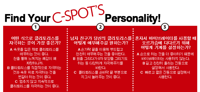 사람마다 쾌감을 느끼는 클리토리스 자극 포인트가 다르다는 사실, 알고 있나? 코스모가 당신에게 딱 맞는 ‘C-스타일’을 알아볼 수 있는 테스트를 준비했다. 그 결과는 곧장 남친과 공유하도록.