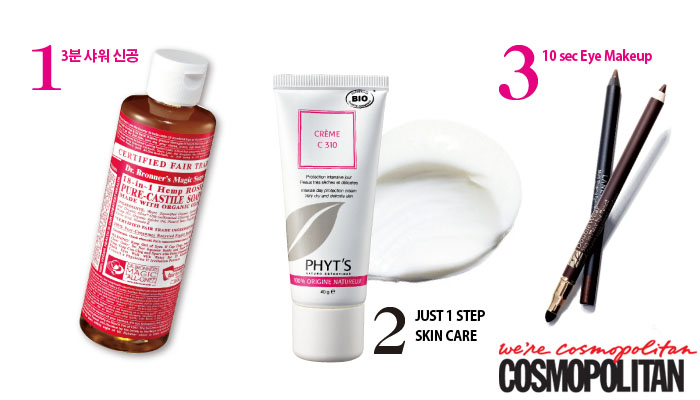 | 1. 3분 샤워 신공 Key Product 헤어, 페이스, 보디, 어디든 사용할 수 있는 톱투토 클렌저는 스피디한 샤워 타임을 위한 필수품! 유기농 제품을 선택하면 민감한 얼굴에도 전혀 자극이 없다. 닥터브로너스 로즈 퓨어 캐스틸 솝 238ml 1만3천5백원. In a Hurry 머리 감으며 세안하고 몸까지 씻어내는 과정을 논스톱으로 진행하자. 샤워기 밑에 서서 온몸을 물에 한번 적신 후 정수리 부분에 톱투토 클렌저를 바로 투하한다. 두피를 마사지하듯 10초 정도 고루 문지른 다음 거품이 충분히 일어나면 바로 얼굴과 몸 구석구석을 손으로 문지르며 스피디하게 터치해줄 것. 그런 다음 샤워기로 한꺼번에 헹구어내면 된다. 2. Just 1 Step Skin care Key Product 아이 크림-에센스-크림의 단계를 한 번에 해결할 수 있는 올인원 크림. 단, 마무리가 실키한 제품을 추천_피츠 크림 C310 by 온뜨레 40g 6만4천원. In a Hurry 세안 후 수건을 사용하는 대신 화장대로 뛰어가는 길에 얼굴을 톡톡 5초만 두드려주면 촉촉함이 느껴지는 정도의 물기만 남을 것이다. 이 위에 바로 올인원 크림을 펴 바르고 지그시 눌러주도록. 벨벳 질감의 마무리 제품을 잘만 선택하면 하루 종일 피부가 촉촉하고 편안하면서도 번들거리지 않고, 리치한 크림 질감 때문에 베이스 메이크업이 밀리는 일도 전혀 없다. 그런 다음 바로 자외선 차단 효과가 있는 비비 크림이나 파운데이션을 안쪽에서 바깥쪽으로 펴 바른다. 이렇게 하면 페이스 라인 쪽으로 갈수록 베이스 양이 줄어들어 빠르고 자연스럽게 입체적인 메 이크업이 완성된다. 3. 10 sec Eye Makeup Key Product 딥 브라운 펜슬 아이라이너와 아이래시컬_에스티 로더 더블 웨어 스테이-인-플레이스 아이 펜슬 02호 커피 2만8천원. In a Hurry 속눈썹 사이사이를 메우듯 딥 브라운 아이라이너를 칠한다. 이때 너무 정교하게 라인을 그리지 않아도 되니 마음 편하게 짧은 가로선을 여러 개 지그재그로 그리듯 터치할 것. 그런 다음 작은 아이섀도 브러시로(급하면 손가락도 좋은 도구가 된다) 라인을 부드럽게 뭉개주기만 하면 라이너와 섀도 그러데이션이 동시에 완성! 마지막으로 아이래시컬러를 평소보다 더 높은 각도로 꺾어 사용해 속눈썹을 짱짱하게 올릴 것. 마스카라는 생략한다. |