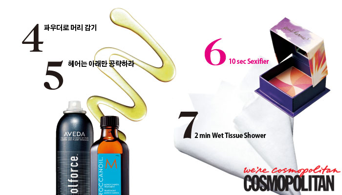 | 4. 파우더로 머리 감기 Key Product 드라이 샴푸 혹은 페이스 파우더_르네 휘테르 나뚜리아 드라이 샴푸 75 ml 2만8천원. In a Hurry 르네휘테르 나뚜리아 드라이 샴푸와 같이 휴대할 수 있는 스몰 사이즈 드라이 샴푸는 바쁜 당신을 위해 반드시 필요한 제품! 물 없이 분사하는 것만으로 머리를 감은 듯한 효과를 볼 수 있기 때문. 위급 시엔 수정용 파우더도 구원 투수 역할을 할 수 있다. 브러시나 퍼프에 파우더를 적당량 묻혀 머리카락을 가르며 두피를 중심으로 톡톡 치듯 터치하고 털어내면 파우더가 피지를 쏙 빨아들여 금세 볼륨이 살아나고 보송보송해진다. 베이비 파우더를 사용하면 상냥한 아기 향까지 나니 일석이조. 5. 헤어는 아래만 공략하라 Key Product 헤어 스프레이, 헤어 롤, 헤어 에센스, 실핀_모로칸 오일 트리트먼트 100ml 6만8천원. In a Hurry 딱딱해지지 않는 스프레이를 헤어 전체에 뿌린 다음 머리끝을 대여섯 갈래로 나눠 예열해둔 헤어 롤러로 말아놓는다. 그런 다음 드라이어로 두피에 가까운 머리카락을 손가락으로 살짝 뒤집어 넘기듯 말린다. 메이크업을 마친 후 롤러를 풀면 적당한 C컬이 만들어져 있을 것이다. 손가락으로 툭툭 털 듯 빗어주기만 하면 끝. 드라이할 시간조차 없을 정도로 다급하다면 타월 드라이한 머리 끝 부분에 헤어 에센스를 바르고 고무줄로 묶은 다음 돌돌 말아 실핀으로 고정할 것. 손에 남은 에센스로 윗머리를 쓰다듬 듯 터치해 마무리하면 마치 레드 카펫 위의 여배우 같은 내추럴 업두가 완성된다. 6. 10 sec Sexifier Key Product 핑크 치크 블러셔 혹은 핑크 립스틱과 페이스 파우더_베네피트 허바나 4만2천원. In a Hurry 밝고 생기 있는 치크 블러셔는 일에 찌든 당신의 얼굴에 급 활력을 불어넣는다. 미세한 펄이 들어간 밝은 컬러의 블러셔를 가볍게 터치하면 영장류인 그의 뇌는 이 아름다운 핑크를 ‘달아오름’의 상징으로 받아들이고 바로 핑크빛 모드로 돌입하게 된다고. 블러셔가 없다고? 핑크 립스틱을 톡톡 찍 듯 뺨에 바른 뒤 펴주고 그 위를 페이스 파우더로 가볍게 누르도록. 이렇게 하면 마치 피부 밑에서 혈색이 비쳐 오르는 듯한 홍조를 연출할 수 있다. 7. 2 min Wet Tissue Shower Key Product 아기용 물티슈, 향수 In a Hurry 아기를 키우지 않더라도 아기용 물티슈는 하나씩 상비해두면 좋은 아이템! 뉴욕의 의사 조디 르바인 박사에 따르면 아기용 물티슈는 민감하고 연약한 아기 엉덩이 피부에 자극을 주지 않도록 만들었기 때문에 몸의 민감한 부위에 사용해도 무방할 정도라고. 화장실로 달려가 이것으로 겨드랑이와 은밀한 부분을 닦아내고 아주 소량의 향수를 뿌릴 것. 불쾌한 냄새가 가시는 것은 물론 새로운 유혹의 시작이 될 수도 있다. |