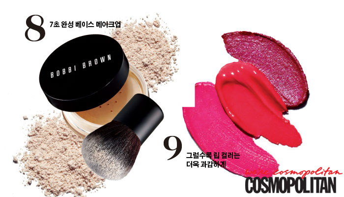 | 8. 7초 완성 베이스 메이크업 Key Product 건조하지 않은 미네랄 파우더 파운데이션_바비 브라운 스킨 화운데이션 미네랄 메이크업 SPF 15 6만원. In a Hurry 커다란 파우더 브러시를 꺼내 들어라. 끝에 파우더 파운데이션을 묻혀 뚜껑에 둥글게 비비며 양을 조절한 다음 지름 5cm 정도의 원을 그리는 듯한 동작으로 온 얼굴에 펴 바를 것. 경계가 생기지 않고 덧발라도 뭉치지 않으며 무엇보다 내추럴하기 때문에 바쁜 아침을 위한 최적의 솔루션 중 하나가 될 것이다. 9. 그럴수록 립 컬러는 더욱 과감하게 Key Product 다양한 텍스처의 핫 컬러 립스틱과 손가락 In a Hurry 아이 메이크업이 심플할수록 핫 컬러 립스틱과 궁합이 잘 맞는다. 앞서 말했듯 딥 브라운 아이라이너를 스머징해 청순한 아이 룩을 연출했으면 입술은 좀 더 과감해져도 된다는 말씀. 단, 립 라인을 따라 또렷이 입술을 꽉 채워 그리는 것은 무리수. 중지에 립스틱을 문질러 입술을 톡톡 두드리듯 레이어하며 바르면 폭신폭신한 질감에 발그레하게 생기가 도는 입술로 연출되며 핫 컬러가 전혀 부담스럽지 않게 발색된다. 게다가 딱 두 군데 터치했음에도 풀 메이크업을 한 듯한 효과가 나니 경제적이기까지 하다. |