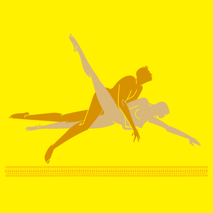 이 열정 가득한 포즈로 두 가지 체위의 장점을 고루 맛볼 수 있다. 후배위 반, 측배위 반의 혼성 체위로, 나란히 누운 자세에서 느낄 수 있는 편안한 친밀감과 G-스폿을 자극하는 깊은 삽입을 하나로 결합시켰다. 남자가 여자를 꼭 붙잡으면 여성이 느낄 수 있는 절정감은 한층 더 커진다. 남자는 양손이 자유롭다는 사실을 그에게 은근히 일깨우자. 그의 손을 은밀한 곳으로 이끌어 클리토리스를 자극하게 한다. 남자가 피스톤 운동을 하는 동안 여자도 손을 뒤로 뻗어 그의 엉덩이를 자극하고 고환을 간질이고 회음부를 애무한다.