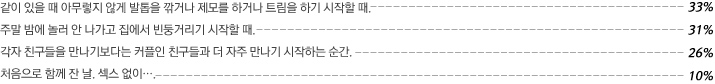 30대 남자의 81%가 파트너와 함께 포르노를 보면 흥분이 된다고 대답했다. 20대 남자의 61%가 그렇다고 대답한 것에 비하면 꽤 큰 차이다. 전문가들에 따르면 20대 때는 같이 포르노를 보고 싶어도 그런 제안을 하는 순간 상대방이 자신을 이상하게 보지 않을까 하는 두려움이 있었지만 30대가 되면 자신의 욕망을 파트너와 자신 있게 공유할 수 있게 되기 때문이란다. 특히 오래된 연인과의 관계에서 뜨거움을 유지하기 위한 방편으로 그런 행동을 하기도 한다고. 그러니까 30대인 그가 대뜸 포르노를 함께 보자고 하거나 새로운 시도를 제안한다면 그가 지루함을 극복하기 위한 방법을 찾고 있다는 신호일지도 모른다.