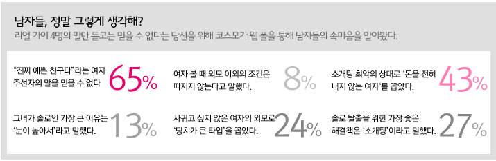 COSMO 게시판 같은 데서 보면 “전 어딜 가든 예쁘다는 말을 듣는데 정작 저보고 사귀자는 남자가 없어요” 이런 사람도 있더라고.