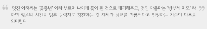 나이에도 불구하고, 아니 나이가 들어서 더 멋있어진 남자, 꽃중년. 고령화 사회에서는 마흔 살의 남자도 아직 청년인 걸까? 그럼 여자는?