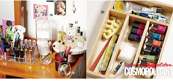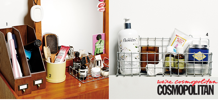 막상 화장대 청소를 하려면 그 위에 잔뜩 쌓인 제품들 하나하나 치우기가 귀찮아 미루고 포기하기 마련. 이럴 때를 위해 매일 쓰는 제품을 바구니에 한데 담아두면 청소가 간편해진다. 바구니는 망 형태로 된 것이 내부에 먼지가 적게 쌓인다.