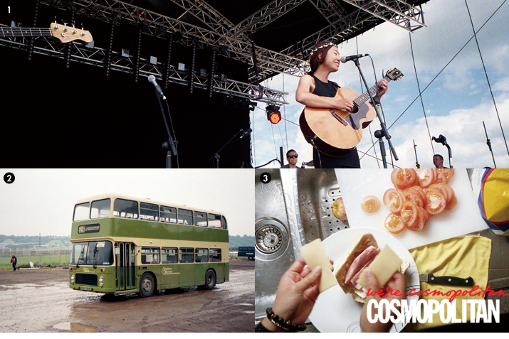 1 실버 헤이즈 존의 ‘Gully_Outer National’ 무대에 오른 나. 잠비나이도 바로 이 무대에 섰다. 2 글래스톤베리 페스티벌 셔틀버스. 3 4박 5일 동안 모든 의식주를 텐트촌에서 해결해야 했다.