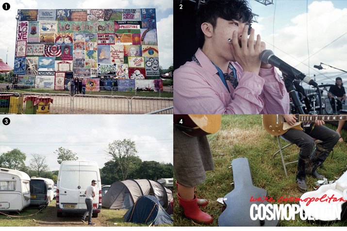 1 공연장 입구에는 환경, 인권, 동물 복지 등의 다양한 메시지가 담긴 작품들이 전시되어 있다. 2 두루두루 악기에 능한 박상흠. 지금은 하모니카 사운드 체크 중. 3 글래스톤베리 페스티벌을 떠나는 날, 우리의 드라이버 ‘데이비드’. 웃음이 멋지고 속 깊은 배려를 지닌 사람! 4 장화는 필수 아이템! 매년 비가 오기 때문인데, 일종의 머드 축제 같다는 기분이 들 정도였다.
