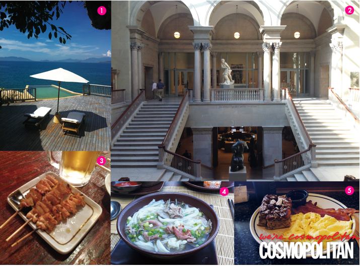 1.나트랑 식스센스 닌반베이 리조트 암벽을 깎아 만든 수영장에서 광활한 에메랄드빛 바다를 바라보며 물장구치던 순간을 잊을 수 없다. 마치 바다 위 상공을 날아다니는 듯 꿈만 같았던 시간이었다 2.시카고뮤지엄 미술관이나 박물관을 혼자서 구경한 적은 처음이었다. 시카고에서 그 경험을 했는데, 오직 나만의 호흡으로 작품을 따라 사색하는 즐거움을 서른이 돼서야 알았다 3.오사카표 꼬치 오사카의 어느 골목에 자리한 이자카야 ‘난반테’. 평일 저녁, 직장인들 틈에서 회식하는 기분으로 맛있게 먹었던 그날 4.베트남 쌀국수 베트남 여행에서 가장 기억에 남는 하나를 꼽으라면 매일 아침 먹었던 쌀국수. 진하게 우려낸 국물, 쫄깃쫄깃 금방 익은 생고기, 보들보들한 면의 식감까지, 어디에서도 그 이상의 쌀국수는 맛보지 못했다 5.시카고 브런치 6일간의 시카고 출장에서 가장 행복했던 순간은 이른 아침 호텔 앞 ‘코너 베이커리’에서 혼자만의 브런치를 즐긴 때였다. 거리를 바쁘게 오가는 직장인들을 구경하며 한적하게 여유를 만끽했다.