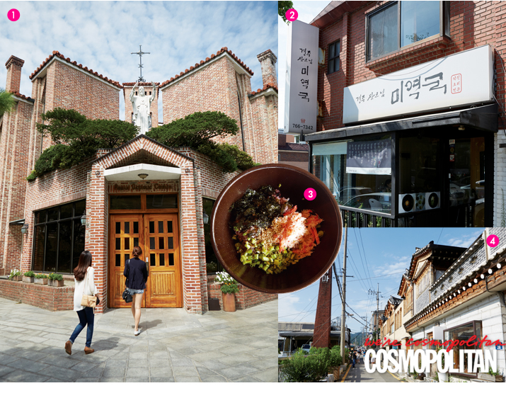 1.드라마 세트장처럼 예쁜 성북동 성당 2.맛있는 미역국을 맛볼 수 있는 곳 3.경주 장모님 미역국의 게살비빔밥 1만원 4.현대적인 한옥이 즐비해 있는 성북동 골목