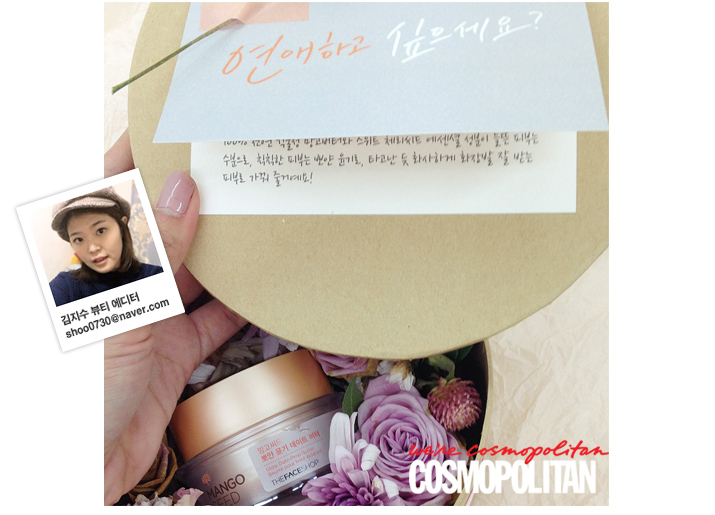 “남자들이 좋아하는 매끈 촉촉 피부 만들기에 딱인 뉴 수분 버터가 ‘연애하고 싶으세요?'라는 문구가 적힌 카드와 함께 꽃에 둘러싸여 사무실에 도착했다. 망고 씨앗 버터가 피부를 촉촉하게 하고, 체리 씨앗이 윤기를 더해줘 ‘화장발 잘 받은 얼굴’로 만들어주는 이 크림과 함께라면 올 가을 썸남 마음 흔들기는 문제없을 듯!” -뷰티 에디터 김지수