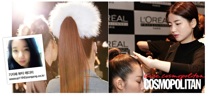 “9월 초 열린 디자이너 알렉시스 마빌의 오트 쿠튀르 쇼. 그중에서도 눈을 사로잡은 건 로레알 프로페셔널 파리 제품을 이용해 연출한 헤어스타일이었다. 차홍 원장이 정성스레 완성한, 위쪽으로 깔끔하게 묶은 뒤 여우꼬리 털로 장식한 ‘하이 포니테일’은 올가을 한 번쯤 시도하고 싶은 워너비!” -뷰티 에디터 기지혜