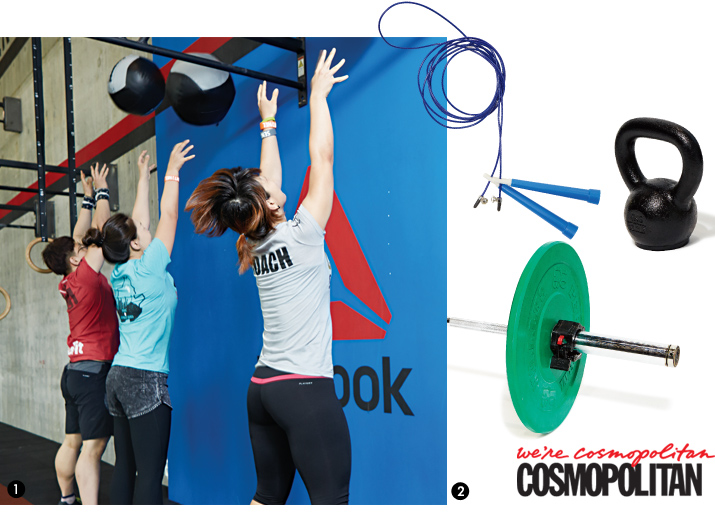 1. 상체운동과 스을 결합한 동작, ‘월볼샷’. 2. 크로스핏 주요 기구 : 역기, 줄넘기, 케틀벨, 박스, 링, 철봉 등 주변에서 쉽게 접할 수 있는 기구와 머신을 사용한다. 별도의 기구 없이 체조 형식으로 진행하기도 한다.
